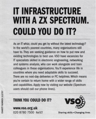 SINCLAIR IN THE 21ST CENTURY 10/03/2002 Years after Amstrad stopped producing the Sinclair Spectrum, its name has appeared in the, er, illustrious and world famous Electronic Engineering Times (EETimes). On page 48 of issue 1074 (11/2/02), a job advert was placed by the VSO, asking: "IT Infrastructure with a ZX Spectrum. Could you do it?". In the text, it states the VSO is looking for IT specialists who can help organisations in some of the world's poorest countries put their ageing technology to the best possible use. Although clearly a bit of a piss-take, we at The Sinclair Lair liked the thought of national banking systems and government databases being run on a room full of 48ks. Okay, in reality they are probably using old 286 and 386 PCs, but it's a nice image isn't it? The final sentance also tickled us: "Apply now by visiting our website (Spectrum users should call our phone lines)." To view a scan of the advert, click here. Do you work in engineering? Are you being paid enough? To find hundreds of vacant and lucrative engineering positions, visit this specialist UK Web site. Queries? Dead Links? Contact the Webmaster. |